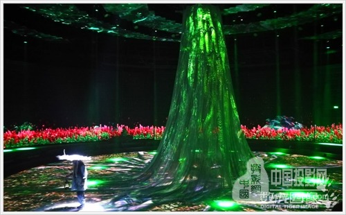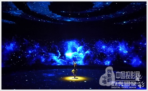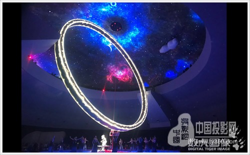 D廳是《天釀》的最后一個展演環節,也是最大的一個廳。展廳以穹頂大空間視覺設計為主,多媒體裝置主要是穹頂直徑30米的LED屏、可調整圓環LED及直徑約40米的碗形舞臺投影。多媒體影像鋪滿上、中、下舞臺空間,呈現包裹式視覺觀感,塑造起大空間大影像,為整劇起到畫龍點睛的作用。