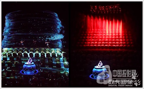 B廳可說是唯美至極的一個表演廳了。如階梯教室般搭建的一排排整齊劃一的酒壇陣,主人翁酉酉端坐在立于中心的巨大酒壇之上,整個酒壇陣通過紗幕投影呈現真人與全息投影影像的互動表演,并配合酒壇陣上的結構投影與投射下來的光陣明暗變化,巧妙呈現時間的流逝、主角內心的云涌變化以及茅臺酒最終勾兌成“天釀”的過程。