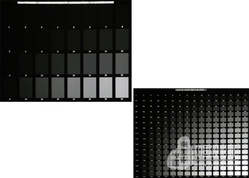 灰階對比度測試時,索諾克Sonnoc SNP-X3500C投影機在3300流明亮度下,投影出的灰階由暗到亮過渡自然,64位灰階、256位灰階都表現得很好,能清晰分辨,在256灰階塊中,只有最左邊兩列少數塊不能分辨,其余的都很清晰,每個色塊的對比還挺分明,表現真的很不錯(需要補充說明的是:所有的圖像顯示實際效果要比相機拍攝效果更好)。
