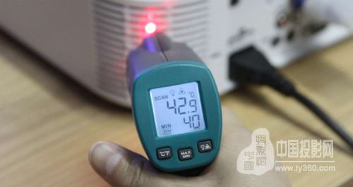 在散熱性能方面,測試當天所在室內溫度為23.5度的恒溫條件,索諾克Sonnoc SNP-X3500C固態光源投影機在進過連續兩個小時的工作后,散熱口溫度為42.9度左右,整體看來溫度還算是在正常范圍內。