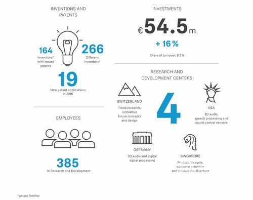 Sennheiser集團再次提高研發投資,比上年增加16%,達到5,450萬歐元。研發開支占營業額的8.3%。四個研發中心總共有385名員工。