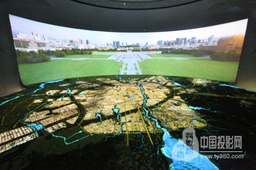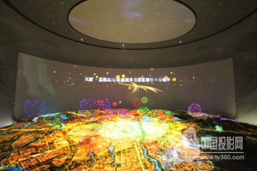 多媒體沙盤廳是一個半球形的立體空間,地面是碩大的智能化大型城市沙盤,周邊是雙曲面弧形屏,頂上是天幕聯(lián)動投影。如此復雜、獨特的沙盤廳設計上在國內(nèi)是獨一無二的,視覺效果非常震撼。