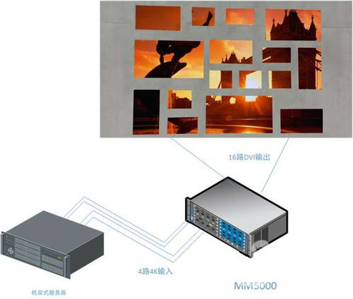 目前上海大視電子科技有限公司(上海股權(quán)交易中心掛牌,企業(yè)名稱:大視科技;股票代碼:201276)的MM5000創(chuàng)意拼接處理器應(yīng)用在松山湖科普館項(xiàng)目中,該項(xiàng)目創(chuàng)意拼接有16塊大小不一的LCD液晶屏組成,而且有橫屏和豎屏混合拼接,傳統(tǒng)的軟件做法是用多臺(tái)服務(wù)器,每臺(tái)服務(wù)器驅(qū)動(dòng)一個(gè)屏幕,但是對(duì)內(nèi)容制作和同步會(huì)帶來很大的挑戰(zhàn),長期運(yùn)行多臺(tái)設(shè)備會(huì)帶來很大的不穩(wěn)定性;采用硬件的傳統(tǒng)做法會(huì)用一進(jìn)四出的創(chuàng)意拼接盒子多臺(tái)做級(jí)聯(lián),最大的輸入分辨率只能支持4Kx2K的輸入,而且調(diào)試及其繁瑣。大視最新一代的MM5000創(chuàng)意拼接處理器解決了以上問題,支持多路4K輸入,支持VGA,DVI,HDMI ,DP,SDI 等信號(hào)輸入,多路輸出,輸出支持不同大小的屏幕,不同分辨率的顯示,也支持橫屏和豎屏混合拼接(如果選用360度旋轉(zhuǎn)的輸出卡可以支持任意角度拼接),同時(shí)支持多路信號(hào)的開窗,漫游,疊加。該項(xiàng)目示意圖如下: