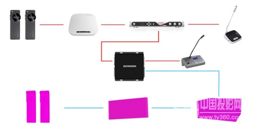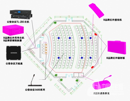 考慮此工程要求成本可控,系統穩定可靠,所以選用較高性價比的5600系列來作為主要設備,根據使用要求與現場條件,采用討論模塊+同傳模塊的組合方案。通過使用公信會議 萬能盒(同聲傳譯音頻轉換器),把B品牌同傳與公信會議討論同傳系統組合在一起,重新形成一套大系統,既實現不同品牌同傳的互聯互通,也實現了雙向互動的新型教學模式,將有效推動該校“智慧校園”的建設步伐。