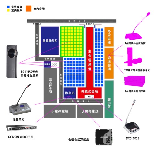 干貨案例二:某會議租賃公司針對一場園林博覽會開幕式,為主辦方提供一套完整的會議系統解決方案。活動的布局由室內和室外兩個會場組成,會議在兩個會場同時舉行。該租賃公司此前購置了T品牌的紅外同傳設備和紅外無線會議討論設備,由于原有設備的數量不能滿足本次活動的所有需求,需進行設備增購。針對活動場地的特點及會議使用需求,公信會議為其設計出一份以30000系列FS-FHSS無線會議系統為核心,結合原有的T品牌設備,通過使用公信會議萬能盒(同聲傳譯音頻轉換器)打造出一套符合活動主辦方使用需求的整體會議解決方案。