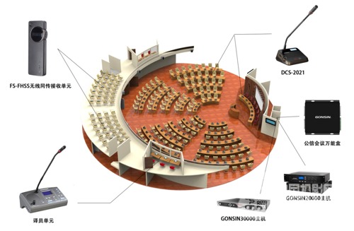 干貨案例三:某政府議會大樓因支持國民參政議政的社會民主建設需求,要解決議會大廳旁聽席的同聲傳譯語音收聽的問題,對其議會大廳進行項目改造。改造實施辦法為增加旁聽席的同聲傳譯設備,增加席位數為100席;一次性投入,使用時間長,要求設備穩定可靠;工期短,需要盡快完成項目改造;要提升旁聽代表的參會效果,保障各類會議的有效進行。該政府議會大樓早前已購入公信20000系列經濟型無紙化會議系統,根據本次項目的改造需求,公信會議為其提供了一份FS-FHSS無線同傳系統的增購方案。