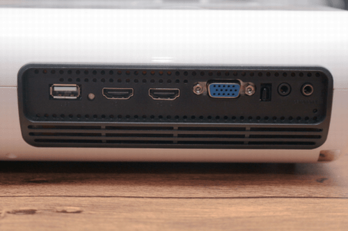 機身背后接口繁多,分別配備USB*1、HDMI*2、VGA、AV*1、耳機*1。立影LDLP500可直接通過USB播放文件,兩個HDMI分別支持16:9以及16:10的比列,當然,除了不能連接手機,常見的設備還是能夠通吃的,其中音頻接口還支持5.1環繞聲道。