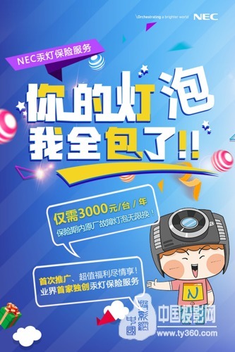 此次NEC推出的全新汞燈保險服務(wù),是NEC在業(yè)界首創(chuàng)首推的超值保險服務(wù)。那么,什么是保險服務(wù)呢?顧名思義,就是在您保險期間,將享受燈泡不限時間不限次數(shù)的故障保障服務(wù),讓您安心省心地使用NEC電影機。那么NEC汞燈保險服務(wù)到底如何幫您省心省錢呢?我們來算筆賬,如果一臺NC900C電影放映機按照2000小時質(zhì)保時間來算,每年至少也要更換1對燈泡,需要4500元;如果按照1500小時質(zhì)保時間,每年至少更換1對燈泡,也需要3500元;