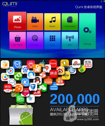 Vivitek(麗訊)微投QUMI Q3 Plus成為QUMI家族首次搭載安卓系統的型號,全新的多媒體界面操作更加流暢,內置8GB存儲容量,用戶可以根據需求下載豐富的應用軟件,將“電視盒子”、“隨身影院”、“商務辦公”等功能集合在Q3 Plus中,用戶可以在娛樂和商務之間輕松“跨界”。