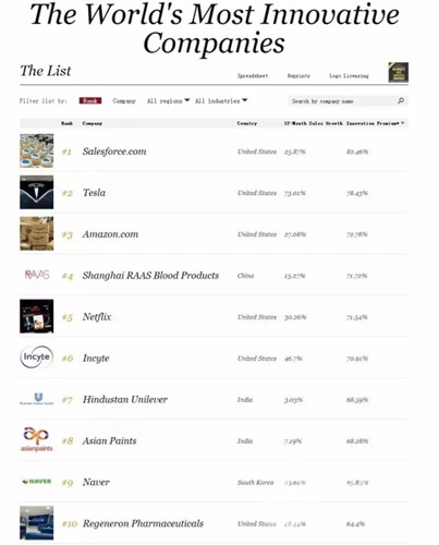 “全球最具創新力企業”榜單由《福布斯》全球與innovator’s dna咨詢公司共同推出,入榜企業須有7年的財務數據、100億美元市值的入選門檻,排名以企業的創新溢價為標準,旨在發現以創新撼動行業的優質公司,為市場提供投資指南。