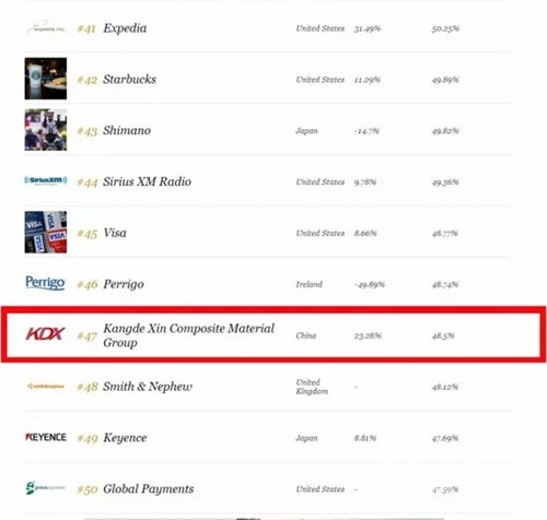 美國當地時間8月8日,《福布斯》全球發布了“全球最具創新力企業”年度榜單。康得新與salesforce、特斯拉、亞馬遜、netflix、寶潔、百事等世界知名企業榮登榜單,以48.5%的創新溢價排名第47位。與康得新同時上榜的有上海萊士、騰訊控股、攜程、百度、恒瑞醫藥等5家中國企業,康得新在中國企業中排名第3。