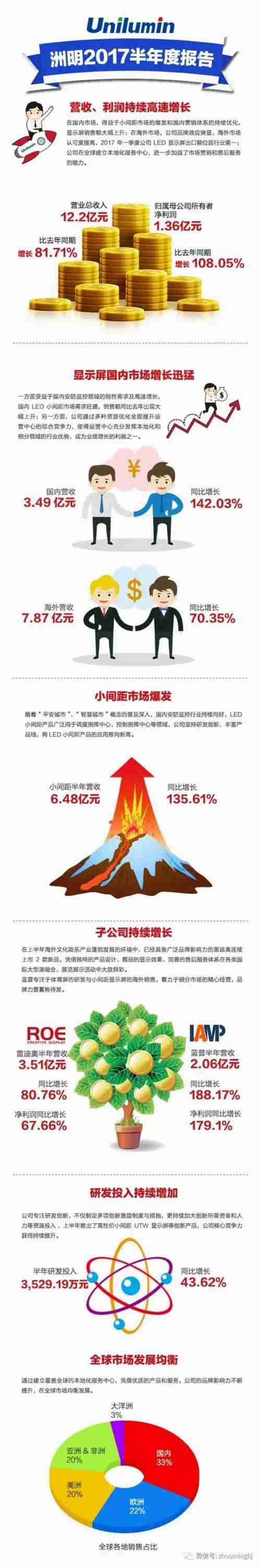 2017年8月28日晚間,洲明科技發布2017年半年度報告,報告顯示,2017年上半年公司收入12.2億元,同比增長81.71%,歸屬母公司所有者凈利潤1.36億元,同比增長108.05%。