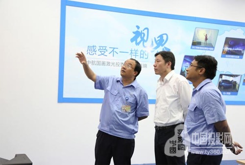 調研期間,周區長一行參觀了中航國畫激光投影展廳,詳細了解了中航國畫大屏弧幕融合、商務會議投影、DLP拼接、家庭影院、飛行模擬器、電子沙盤等解決方案。上電董事長蒲毅向來訪領導深入介紹了公司在激光顯示技術的應用成果和激光投影應用方案,并邀請客人現場體驗了模擬駕駛等項目。