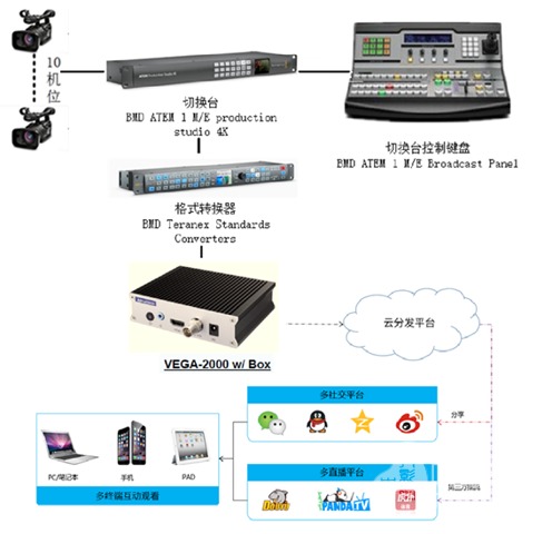 (圖注:現(xiàn)場(chǎng)攝影素材經(jīng)編碼, 直接存至VEGA-2000再通過(guò)網(wǎng)絡(luò)傳輸?shù)椒⻊?wù)器,經(jīng)過(guò)工作人員的現(xiàn)場(chǎng)編輯,就可以直接傳輸?shù)矫襟w平臺(tái),社交平臺(tái)以及多直播平臺(tái)。)