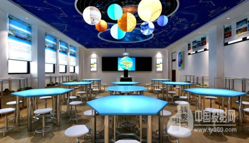 該教室占地102.25平方米,風格上依然延續藍白風,設計簡約又充滿科技感。與以往專用地理教室相比,教室吊頂層不僅有宇宙星空演示用的天文穹頂,還增加了懸掛式立體太陽系星球,在燈光的襯托下仿佛置身于其中,宇宙的無窮奧秘等著你去探索,這種情境式的教學環境能夠使學生快速進入學習地理的狀態,提高課堂效率。