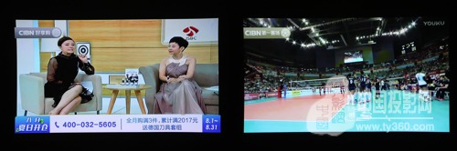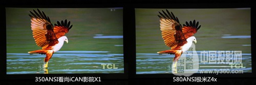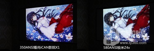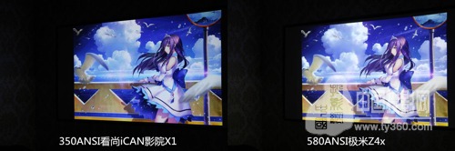 圖一中:看尚iCAN影院X1的亮度是350ANSI,圖二中:極米Z4x亮度是580ANSI,通過在開關(guān)燈情況下的對(duì)比發(fā)現(xiàn),由于整體的流明度兩臺(tái)機(jī)器都不到1000ANSI,所以如果想要開燈或者白天看客觀的說還是有點(diǎn)吃力,但是在關(guān)燈情況下我們也可以看到兩臺(tái)投影的效果都不錯(cuò),最讓筆者吃驚的是相差了230ANSI的兩臺(tái)機(jī)器整體效果相差不多!