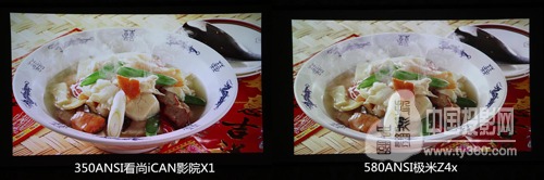 再來通過兩張食物圖片對(duì)比一下,極米Z4x在色彩方面偏白的情況還是存在,亮度相差了230ANSI的兩臺(tái)機(jī)器在同等的室內(nèi)環(huán)境下,投放70寸大小的畫面,幾乎看不出明顯的亮度差距。