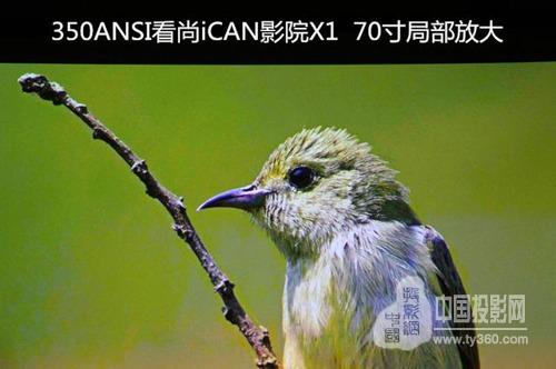 在將畫面局部放大之后,可以看到小鳥的羽毛細(xì)節(jié)也能很好的投放還原,絲毫沒有模糊和不清楚的情況,看尚iCAN影院X1的1.2比1的短焦投射,可以在2.6m的距離投放出100寸的效果,小戶型也能輕松使用!