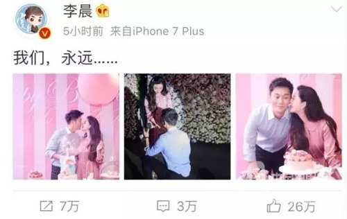 今天是范冰冰36歲的生日,就在這天李晨選擇向她求婚,結束了兩年的愛情長跑。凌晨01:12分,李晨曬出三張求婚圖,并配上文字“ 我們,永遠......”