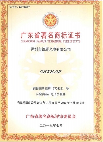 2017年7月,經(jīng)廣東省著名商標(biāo)評審委員會(huì)評審?fù)ㄟ^,廣東省工商行政管理局公布了2017年“廣東省著名商標(biāo)”名單,深圳市德彩光電有限公司獲此殊榮。