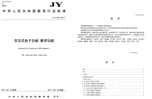 這兩項標準分別是國家教育行業標準JY/T0614-2017《交互式電子白板 教學功能》和國家教育行業標準JY/T0615-2017《交互式電子白板 教學資源通用文件格式》。此兩項標準已于2017年8月24日正式頒布實施。