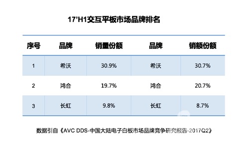 前不久,奧維云網公布的《AVC DDS-中國大陸電子白板市場品牌競爭研究報告-2017Q2》數據顯示,2017年上半年交互智能平板市場中,希沃以30.9%的市場高占比穩居榜首,持續領跑行業。