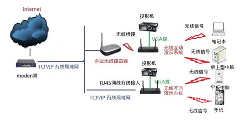 無線互動演示系統使用無線或有線橋接功能與教室的無線AP路由器橋接或以RJ45網線跟無線互動演示系統連接實現邊投影邊訪問網絡資源的功能。