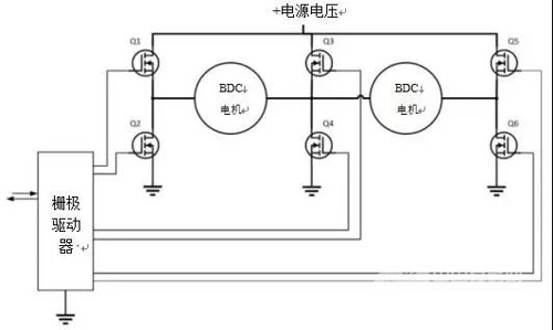 由于座椅包含多種電機,有時可能有必要通過共享的開關MOSFET來簡化驅動電子器件。圖2展示能驅動兩個電機的三個共享半橋。一般來說,N+1個半橋電路能驅動N個獨立的BDS電機。