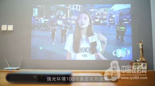 在效果上面的表現呢,我再怎么描述都不如直接放實拍圖片來得直接。這一張是室內開窗且開完所有燈光的環境下拍攝的效果,可以看得出來在這種光線下面的表現已經很好了,畢竟以前的很多投影儀都是“見光死”啊。但對于我來說,還是更加在意它在晚上的投影表現,因為白天現在大家都要上班,都是晚上回家才看電視。