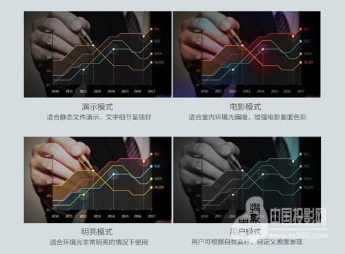 更貼心的是,有鑒于現(xiàn)代會議過程中視頻播放次數(shù)的不斷增加,明基E560還特別提供了電影模式,16:10寬屏,讓視頻展示更賞心悅目,兼顧令人滿意的清晰度;而對于一些有特殊需求的用戶,E560也貼心準備了用戶模式,用戶可以根據(jù)自我喜好,自由調(diào)節(jié)畫面表現(xiàn),大大提升用戶在使用試過程中的滿足感。