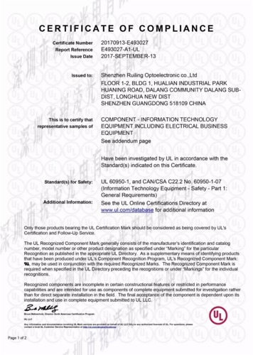 恭喜銳凌通過美國最有權威的安全認證機構認證,獲得UL認證證書。