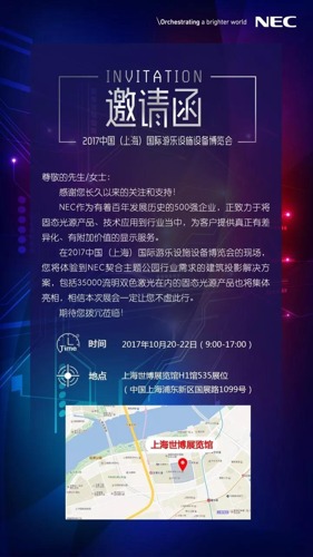 10月20-22日,2017中國國際游樂設施設備博覽會將于上海世博展覽館舉辦,NEC將攜35000流明雙色激光投影機以及行業應用方案亮相本次展會。