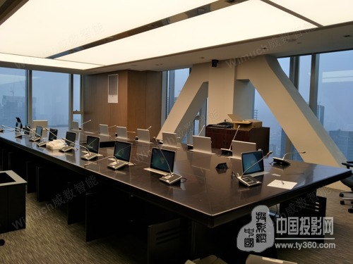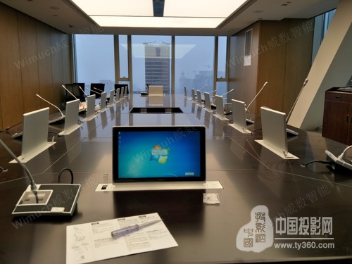 董事會議室會議桌選用18臺超薄鋒刃電容觸摸升降一體終端。整機采用超薄設計,寬度僅為73mm,表面使用5mm鋁拉絲細紋陽極氧化著色工藝處理,精致美觀;內側15.6”高分辨率(1920*1080)真彩數字液晶屏,液晶屏為電容屏多點觸摸式,查看及操作簡單、便捷,系統可支持無線鍵盤鼠標或手寫板。