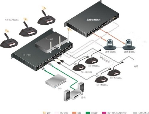 為滿足會議室的安全性、可靠性、易操作性,CHARTU長圖設計了數字會議系統、高清攝像系統、信號切換系統來實現本項目的應用。具體配置如下:一臺CH-2000會議主機,一臺CH-M2100A會議主席單元,九臺CH-M2200A會議代表單元,兩臺CH-CAM高清攝像機,一臺CH-DVI401S高清切換矩陣。
