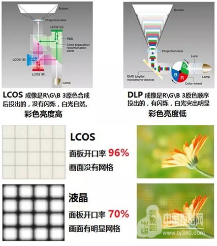 目前市場成熟的投影技術(shù)有3種:液晶、DLP(單片/3片)、LCOS。LCOS最晚問世,但是其明顯優(yōu)勢很快被市場接受。主要體現(xiàn)在彩色亮度高、色域?qū)挕]有網(wǎng)格。這些優(yōu)勢與單片DLP系統(tǒng)斷續(xù)合成的色彩表現(xiàn)、突兀的白光刺激,和液晶機明顯的網(wǎng)格畫面形成明顯反差。