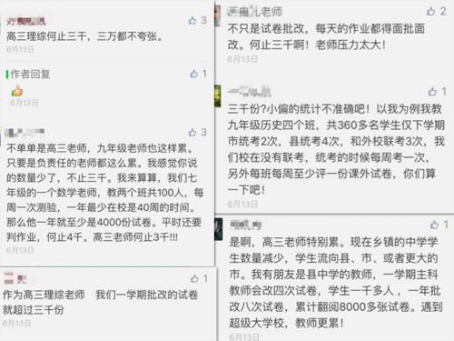 結果,這個“保守估計”引來眾多老師的抗議——大量老師認為一學年的試卷批改量遠不止三千份!