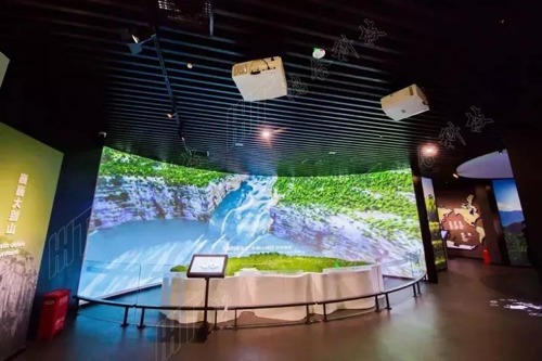 “大別山旅游資源”展項(xiàng)由兩臺NEC新款高清投影PA803U+智能融合成一個寬8m的大畫面,著力為游客打造出大別山地質(zhì)文化資源的無窮魅力。