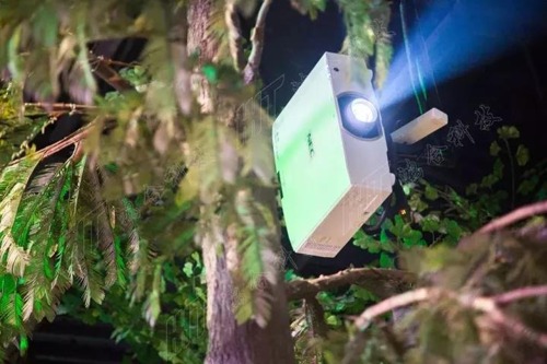 “大別山瀑布”展項(xiàng)中,該系統(tǒng)僅用一臺NEC PA803U+采用豎向側(cè)射的方式,巧妙安裝在周圍的景觀樹上,有力保證了展項(xiàng)的整體美觀性、維護(hù)便利性,而密閉內(nèi)循環(huán)防塵散熱系統(tǒng)一舉解決了投影機(jī)光引擎和光源的防塵問題,降低了維護(hù)成本。