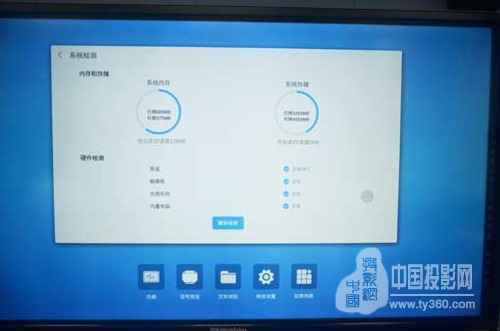 系統(tǒng)檢測功能附于安卓系統(tǒng)內,電教老師可以根據(jù)檢測數(shù)據(jù),查看交互平板的存儲空間狀態(tài)、屏幕溫度、觸摸框、光感系統(tǒng)、內置電腦的正常運作情況,一但出現(xiàn)問題,可以準確地判斷出問題所在,方便用戶有針對性地進行維修。