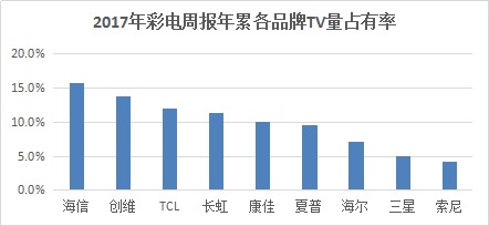 根據(jù)中怡康最新公布的周報(bào)數(shù)據(jù),截止到2017年12月31日,海信電視的銷售量和銷售額占有率分別為:15.7%、16.8%,雙雙高居行業(yè)第一位,而且對(duì)第二名的領(lǐng)先優(yōu)勢(shì)進(jìn)一步擴(kuò)大。至此,海信電視已經(jīng)連續(xù)14年高居彩電市場(chǎng)榜首.