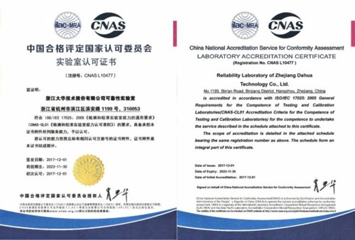 日前,大華股份可靠性實驗室憑借先進(jìn)的硬件配備、較高的管理水平、過硬的團(tuán)隊素質(zhì)、規(guī)范的現(xiàn)場操作順利通過中國合格評定國家認(rèn)可委員會(英文縮寫為:CNAS)認(rèn)證,表明大華可靠性實驗室具備了按相應(yīng)認(rèn)可準(zhǔn)則開展檢測和校準(zhǔn)服務(wù)的技術(shù)能力,標(biāo)志著大華可靠性實驗室的管理水平和技術(shù)實力已達(dá)到國家領(lǐng)先水平,實驗室將與國際接軌,產(chǎn)品質(zhì)量實現(xiàn)國際通行。