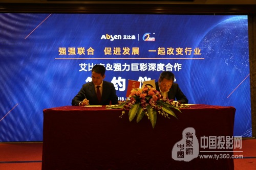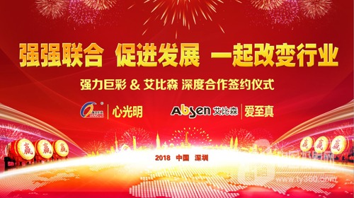 2018年1月10日,廈門強力巨彩光電科技有限公司與深圳市艾比森光電股份有限公司在深圳大中華喜來登酒店成功舉辦深度合作簽約儀式。強力巨彩朱志強董事長和艾比森丁彥輝董事長現場簽訂深度合作協議,一同開啟強強聯合、促進發展、一起改變行業新紀元。