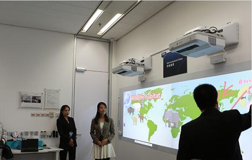 圖:愛普生工作人員為參會媒體演示愛普生雙屏互動教育投影機