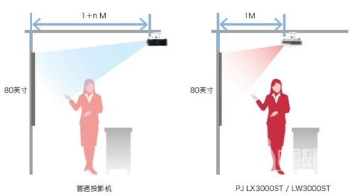 普通投影機與理光PJ LX3000ST投射80寸畫面距離對比
