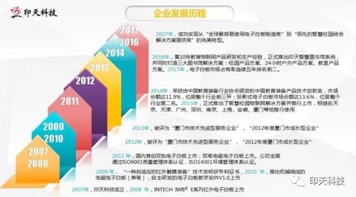 印天科技自2007年創(chuàng)立以來,始終堅持“誠信敬業(yè)、團結(jié)奉獻、以人為本、開拓創(chuàng)新”的企業(yè)精神,不斷發(fā)展壯大,更在2017年積極應對市場挑戰(zhàn),抓住發(fā)展機遇,成功實現(xiàn)從“全球最容易使用電子白板制造商”到“領(lǐng)先的智慧校園綜合解決方案提供商”的完美轉(zhuǎn)型。
