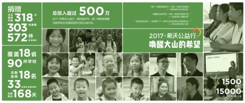2017年,希沃發起“喚醒大山的希望——2017希沃公益行”,為全國18個省共90所學校了捐贈了318臺交互智能平板設備,并組織18名一線教師和33名希沃支教講師團隊一起深入大山,助力鄉村教育信息化事業的發展,超過1500名鄉村教師,15000名學生從中受益。