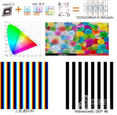 隨著4K的普及應用及家庭娛樂時代的到來,4K家庭影院投影機正成為影音用戶的優先選擇。優派PX727-4K采用TI 4K顯示芯片,符合美國消費者技術協會(CTA)對于4K超高清畫面的標準定義。4K UHD(3840X2160)分辨率可達四倍于Full HD的清晰度,XPR功能可顯示830萬像素,令畫面栩栩如生。12000:1對比度可提供更多的圖像細節,為用戶帶來4K真“視”界。此外,PX727-4K 配備2200lm亮度并支持HDR投影顯示功能,通過畫質處理引擎還原HDR信號中的亮色信息,自動調節區域間的亮度,提升畫面高亮與暗部細節表現,為用戶呈現明亮的白色及深邃的黑色,與普通HDTV對比度及動態范圍相比,可帶來更好的亮暗對比并呈現更真實且鮮艷的投影畫面。三片式LCD投影在投射超高清影像時,由于液晶面板的光線疊加易在畫面邊緣產生疊影、溢色、損傷畫質及清晰度現象,優派PX727-4K投影機采用了獲奧斯卡獎的TI DLP DMD,可實現數字影院顯示功能,4K畫面清晰且色彩自然。