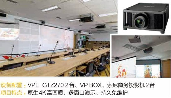 為此對比各種投影顯示系統解決方案,最終選擇了索尼4K激光工程投影機VPL-GTZ270。會議室主屏應用兩臺VPL-GTZ270 拼融呈現,會議室環境采光很好,投影屏幕畫面依然保持了出色的畫質效果。其原生4K分辨 率所實現的高清晰度畫面,在大尺寸屏幕上依然能夠使畫面精致細膩的顯示出來,無論是文檔、表格、圖片還是遠程會議視頻,投影畫面都非常出色。