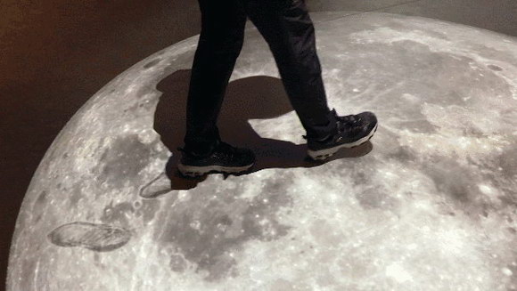 返回艙前有個(gè)醒目的月球圖案,這看似簡單的投影也是大有乾坤。腳只要踩上去,就會(huì)出現(xiàn)腳印,正應(yīng)了阿姆斯特朗登月后的那句:“這是我個(gè)人的一小步,卻是人類的一大步。