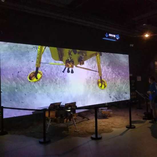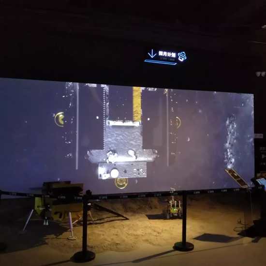 9號(hào)宇宙模擬了月球一角,展示了兩臺(tái)探測機(jī)器人,直觀地讓大家看到了月球表面的地質(zhì)差異,大家可以通過操控臺(tái)操縱一臺(tái)玉兔探月車在“月球表面”行進(jìn),采集月壤。背后的巨幅屏幕使用了兩臺(tái)視美樂SML-PU550投影機(jī),畫面以探月車為第一視角,同步展示探月的過程。